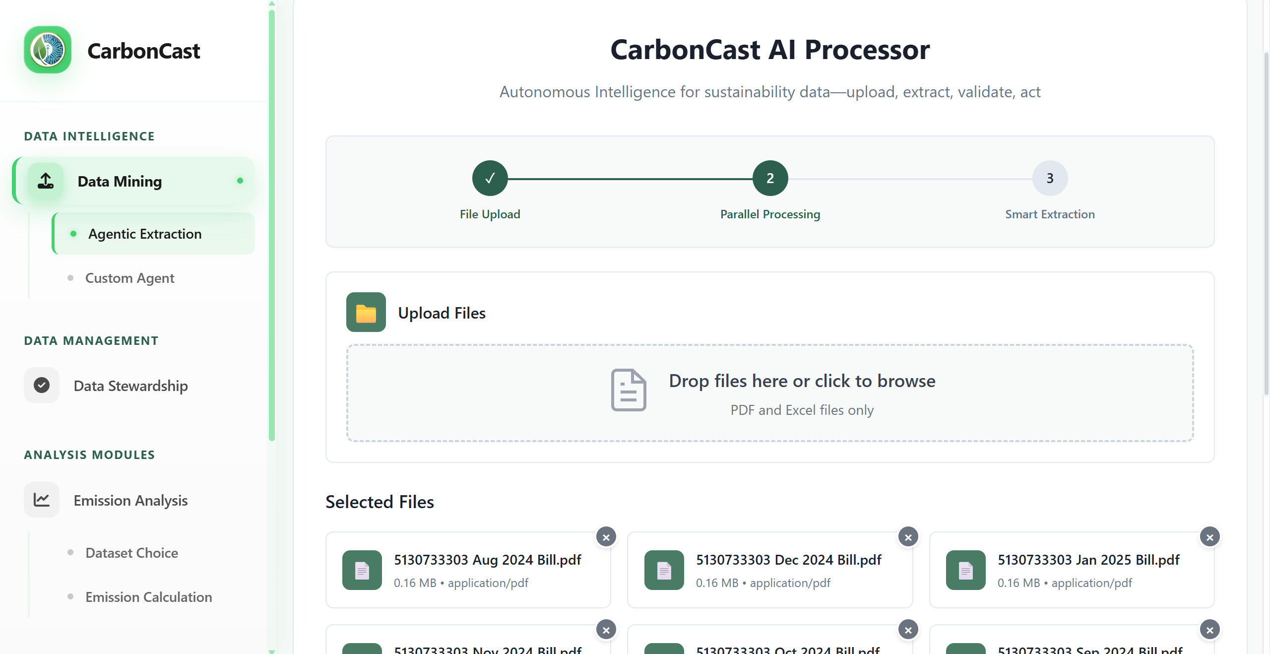 Instead of manually compiling spreadsheets and reconciling emissions data across departments, CarbonCast ingests information directly from documents such as utility bills, vendor invoices, and operational logs. Using advanced AI-powered data extraction and emissions modeling, the platform automatically categorizes activities, maps the appropriate regional emission factors, and generates accurate Scope 1, Scope 2, and Scope 3 carbon calculations.