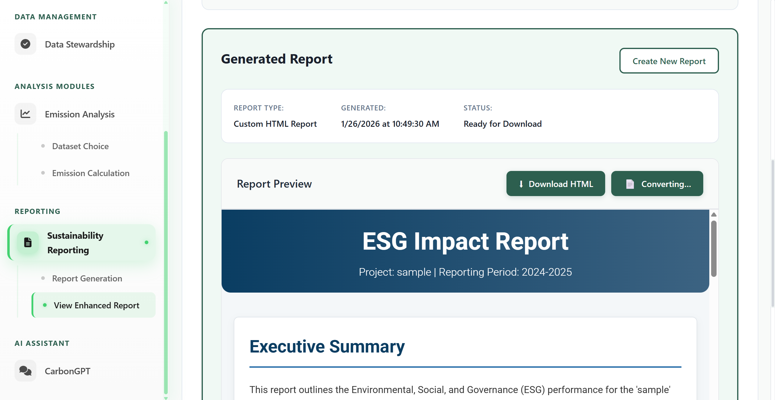 Generate executive-ready sustainability reports that align with recognized ESG and carbon accounting methodologies.